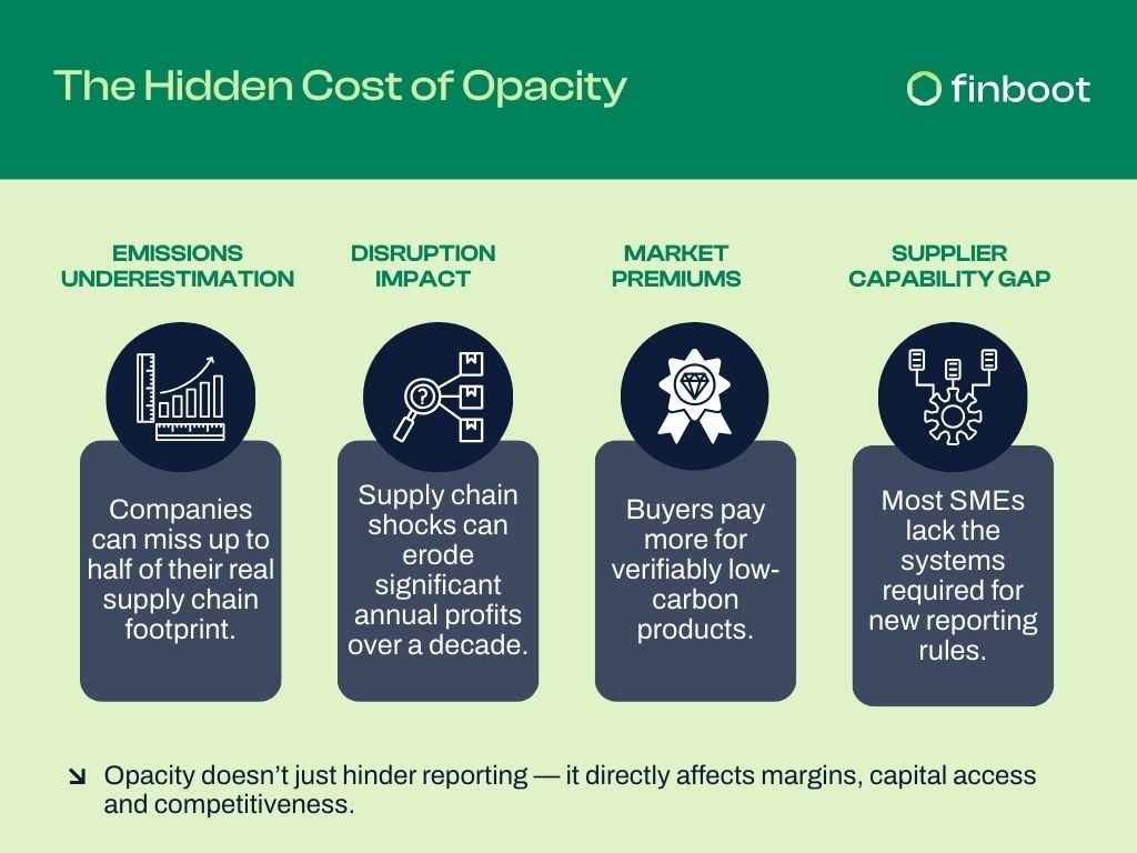 Opacity also narrows a company’s ability to differentiate at a moment when markets increasingly reward verifiable sustainability performance. Research from McKinsey shows that B2B buyers are now willing to pay 5–20% premiums for products with demonstrably lower carbon intensity or traceable origins (McKinsey: The case for green products). Without credible transparency, companies are pushed into competing solely on price in sectors where price competition is already severe.
