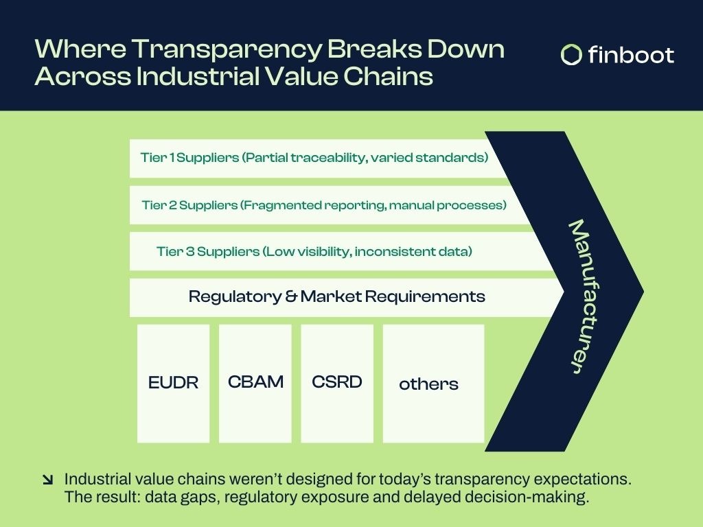 One reason for this shift is the increasing financial cost of opacity. According to CDP, companies with incomplete supply chain data underestimate their emissions by around 50% (CDP Supply Chain Report). This blind spot has material consequences. The European Union’s emerging regulatory frameworks—from the Corporate Sustainability Reporting Directive (CSRD) to the EU Deforestation Regulation (EUDR) and the Forced Labour Regulation (EU Forced Labour Regulation)—now link supply chain transparency directly to market access, financial exposure and credibility. Missing or unverifiable supplier information is already slowing investment decisions and undermining capex planning, particularly in sectors such as steel, chemicals and mining where margins are thin and asset replacement cycles are long.
